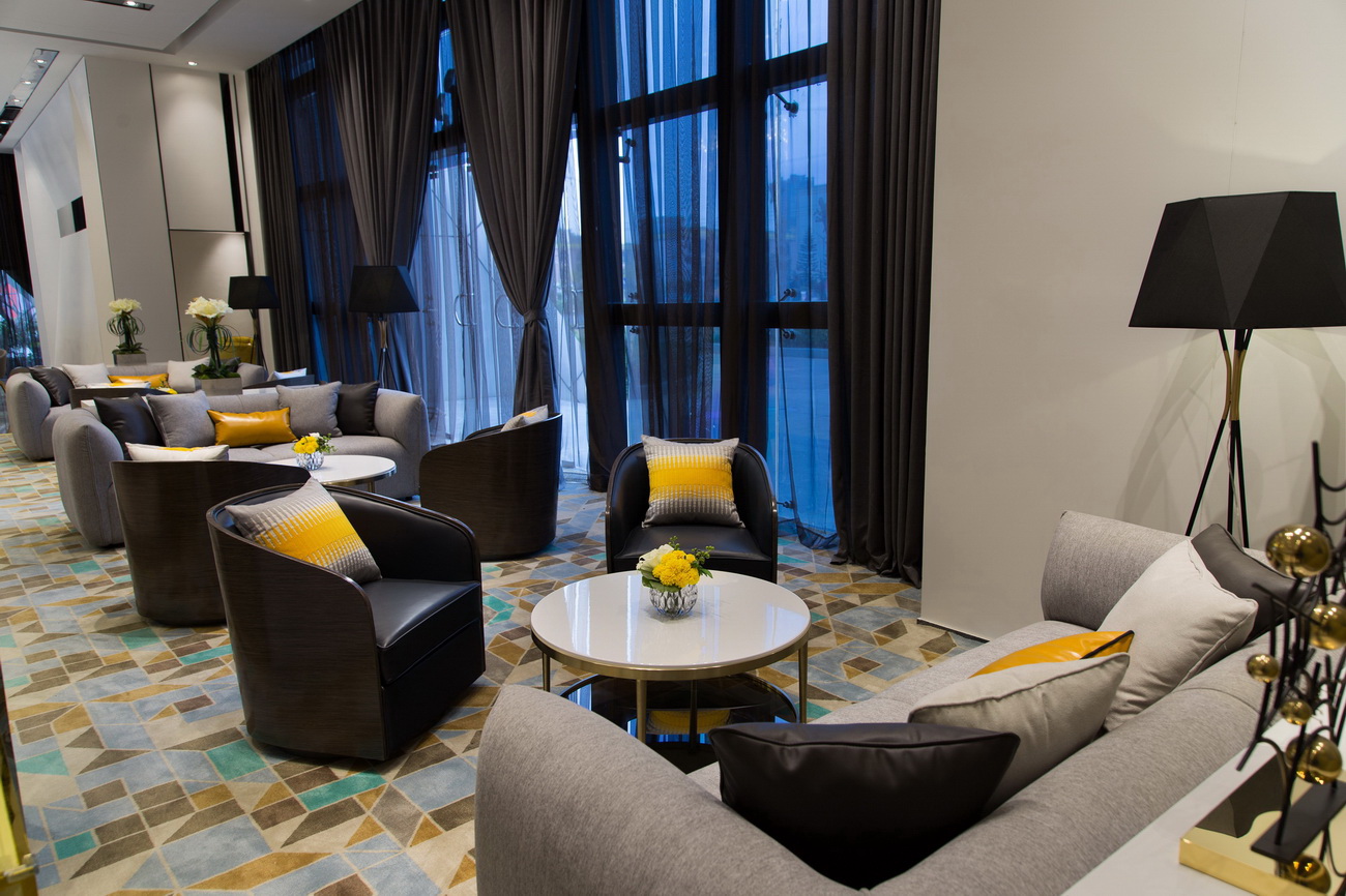本案布局主要分為上下兩層,一樓為前臺(tái)接待區(qū)、模型區(qū)、洽談區(qū)、吧臺(tái)、VIP室及辦公室;二樓則包括VIP洽談室及銀行簽約區(qū)。