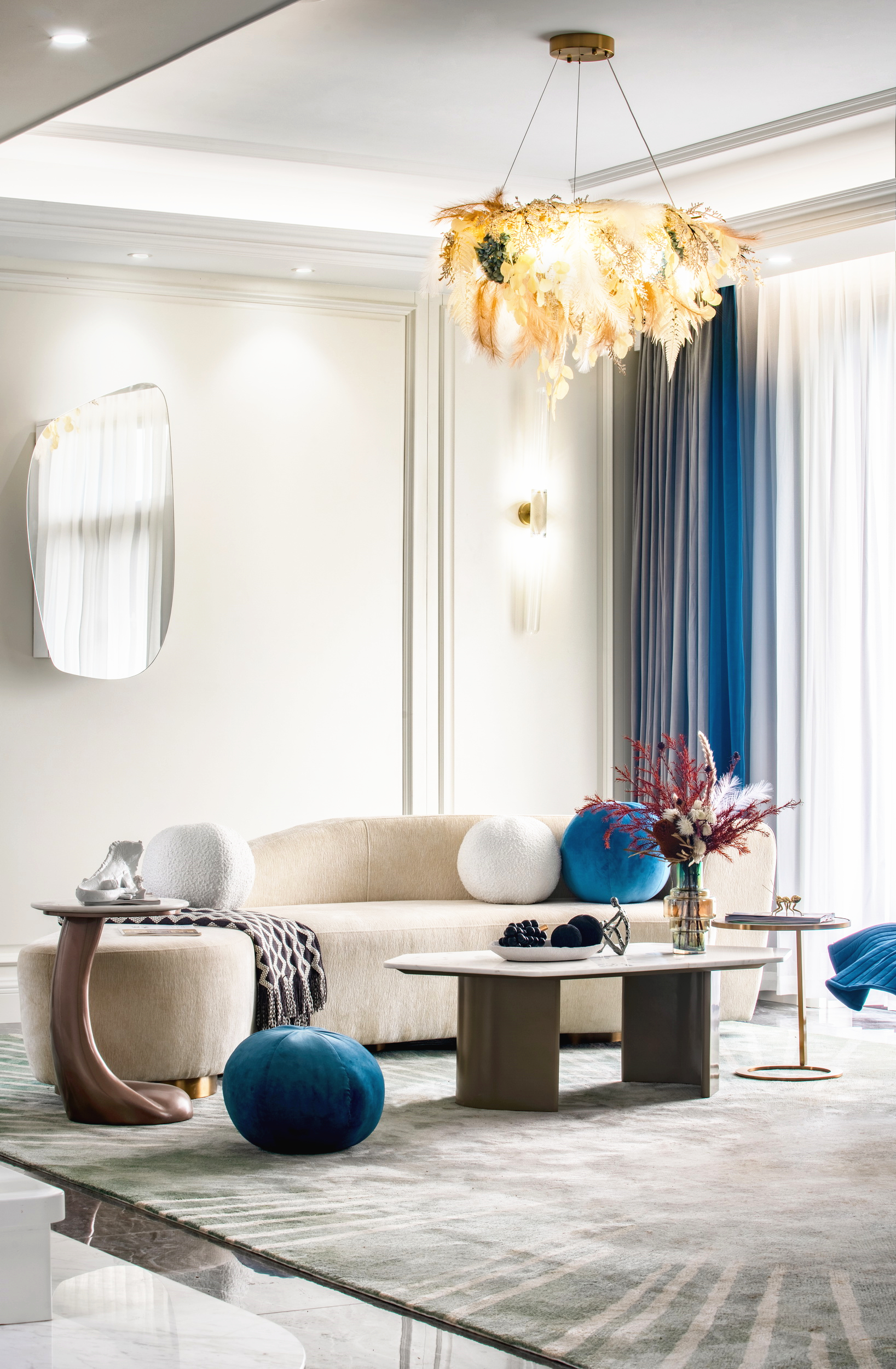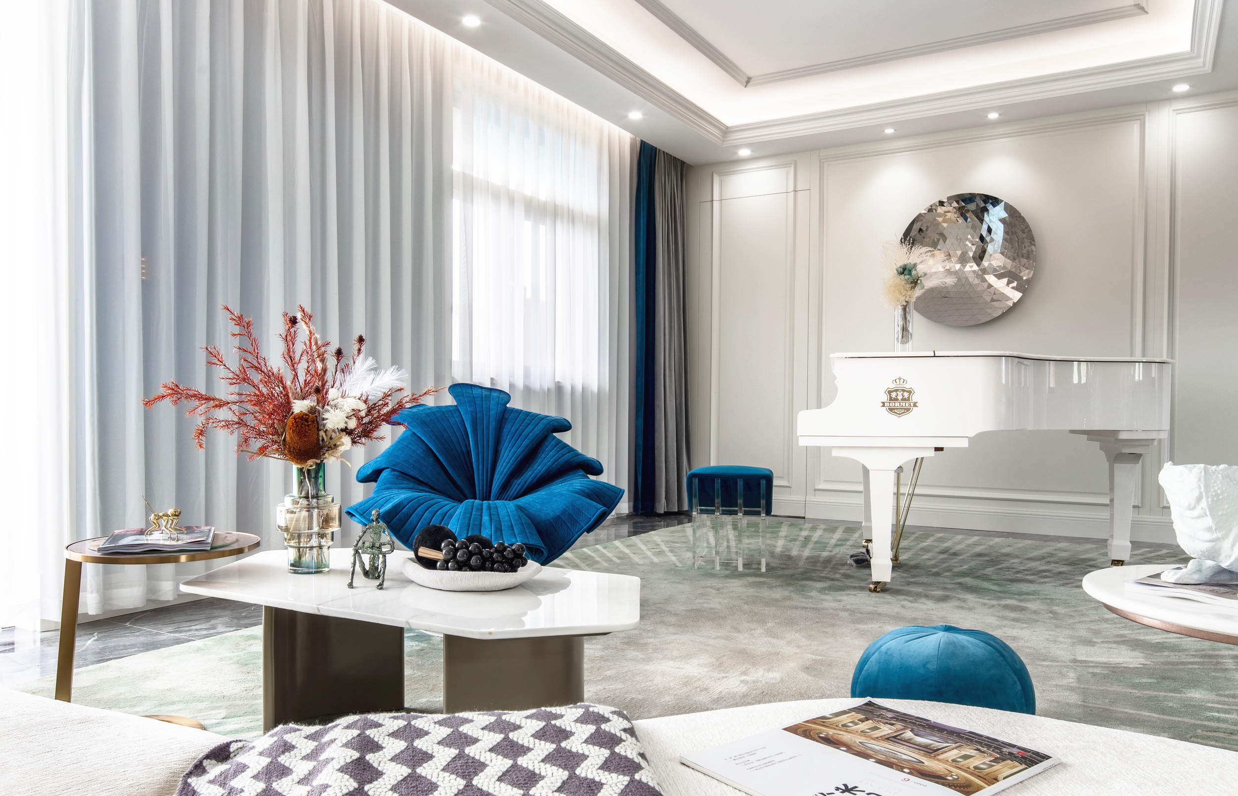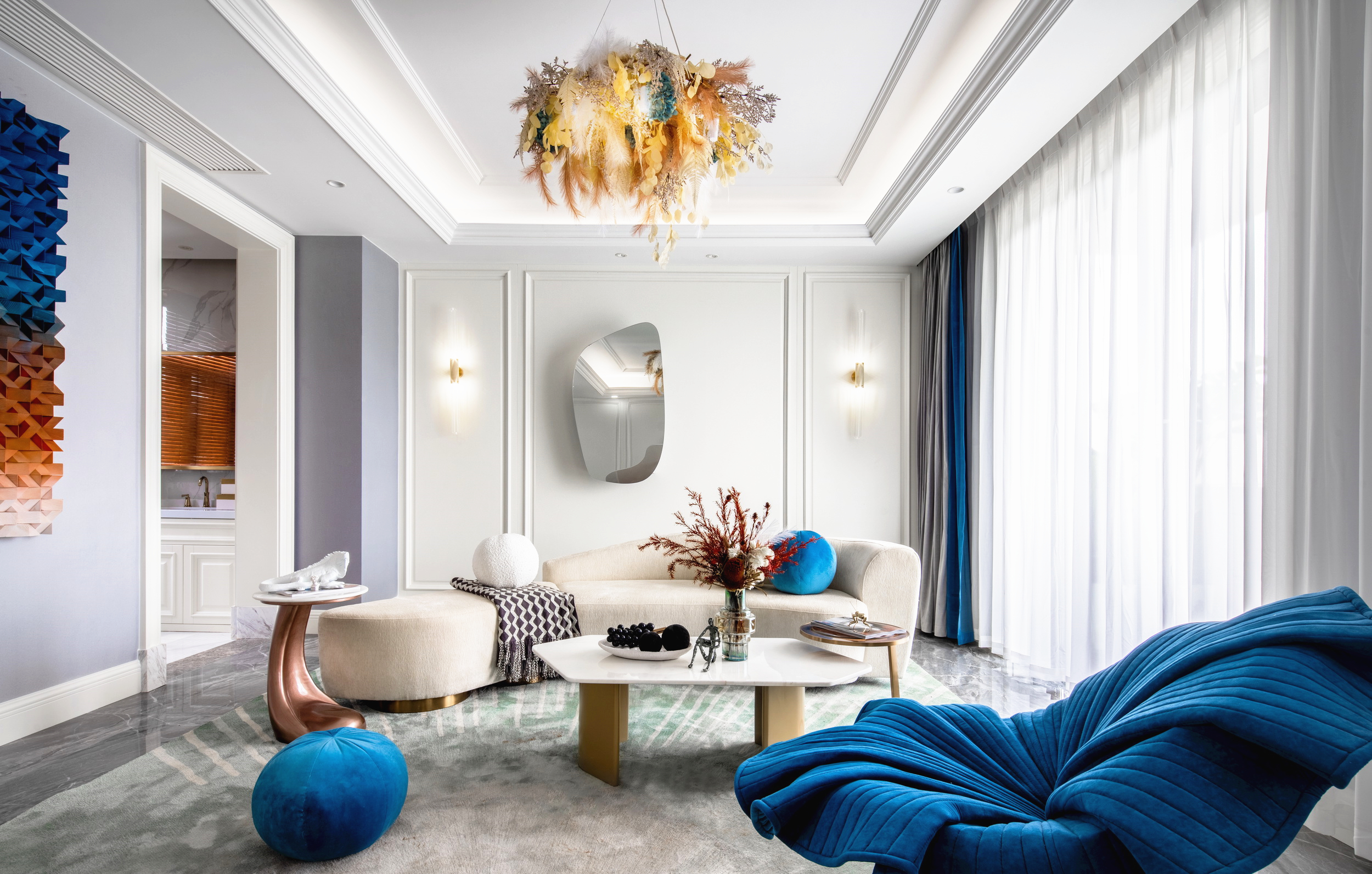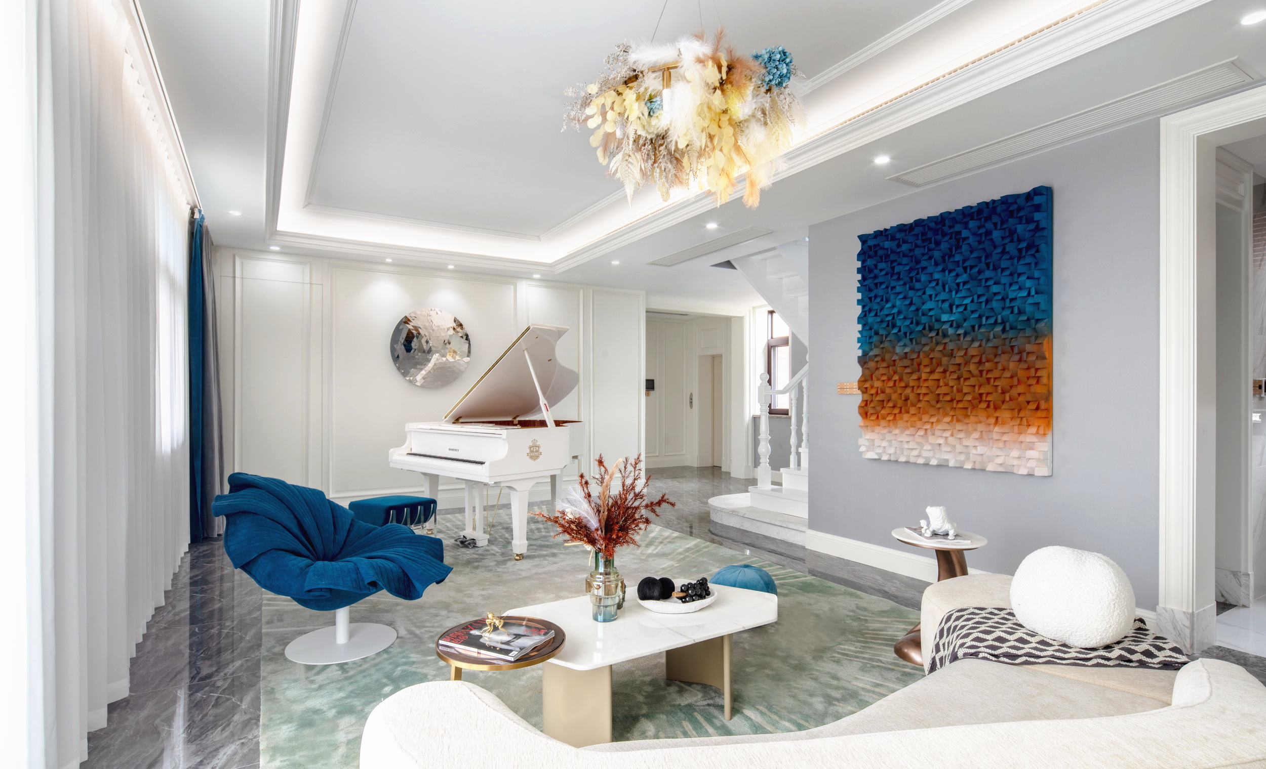 優(yōu)雅浪漫的藍(lán)調(diào),不繁復(fù),是空間的主角;些許暖橙是點(diǎn)綴,增添視覺層次;依托大量清新的淺色軟裝,空間內(nèi)色彩變化平緩過渡自然,與深灰色石材地面遙相呼應(yīng),讓置身其中的人,感受溫暖與明快。