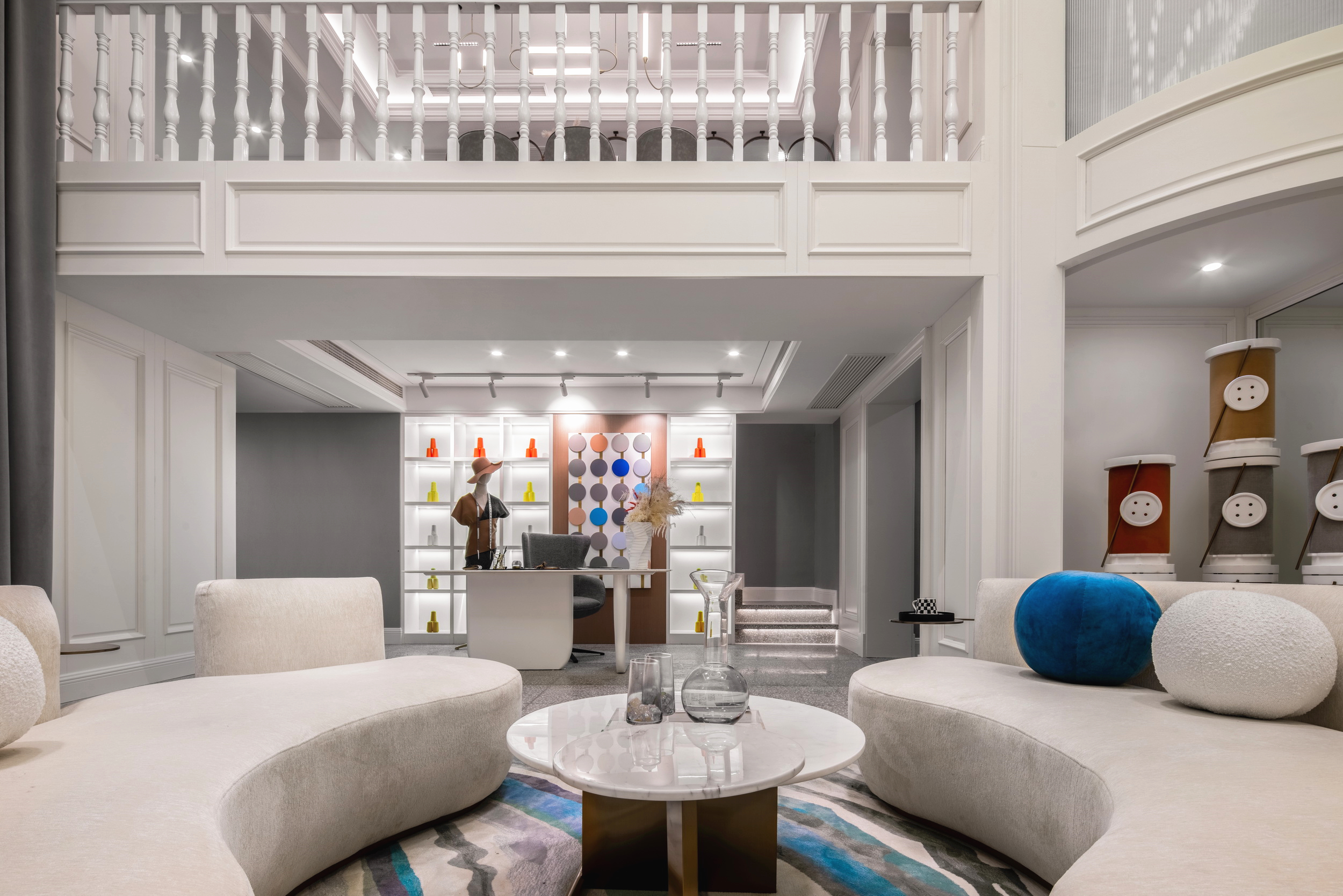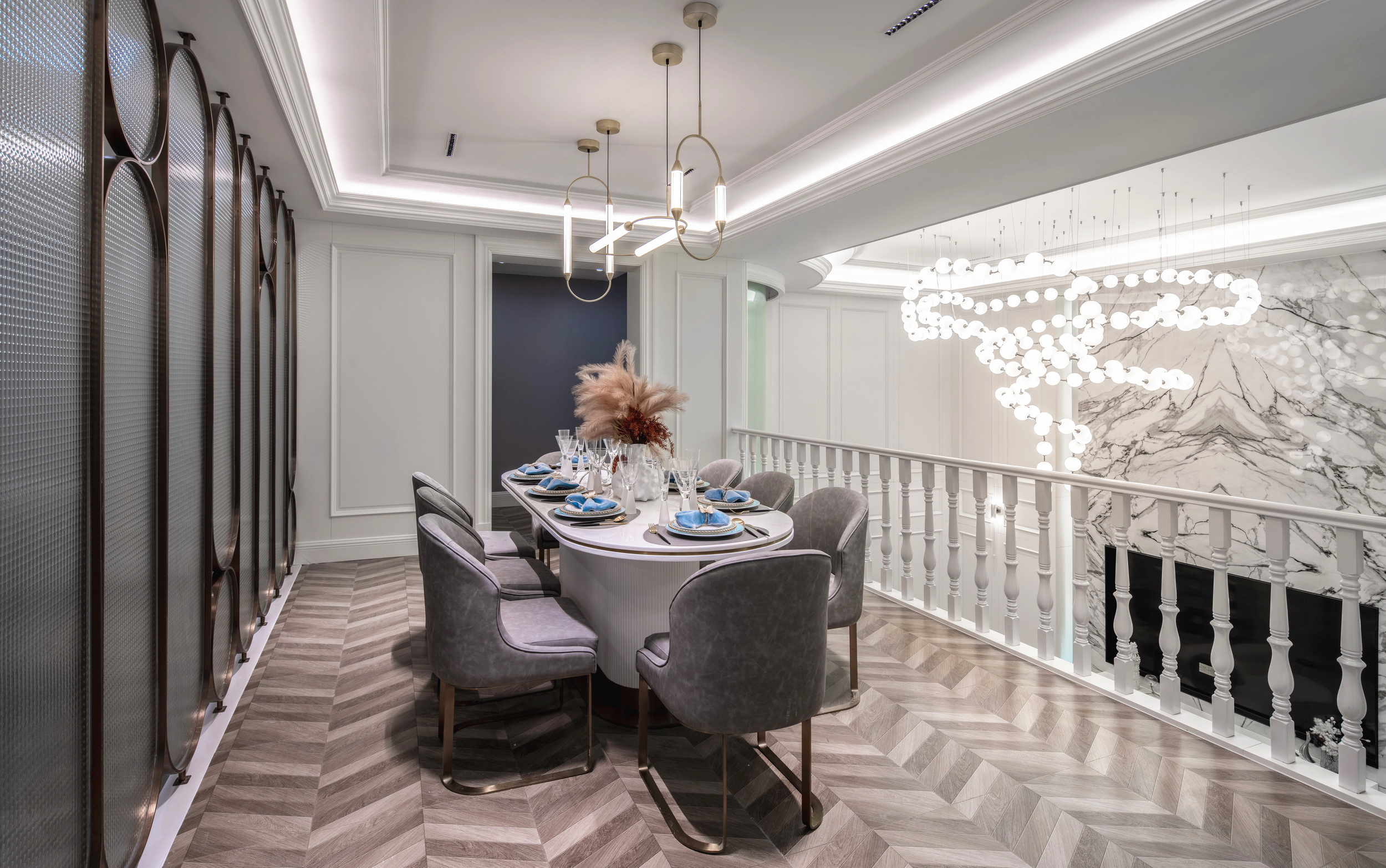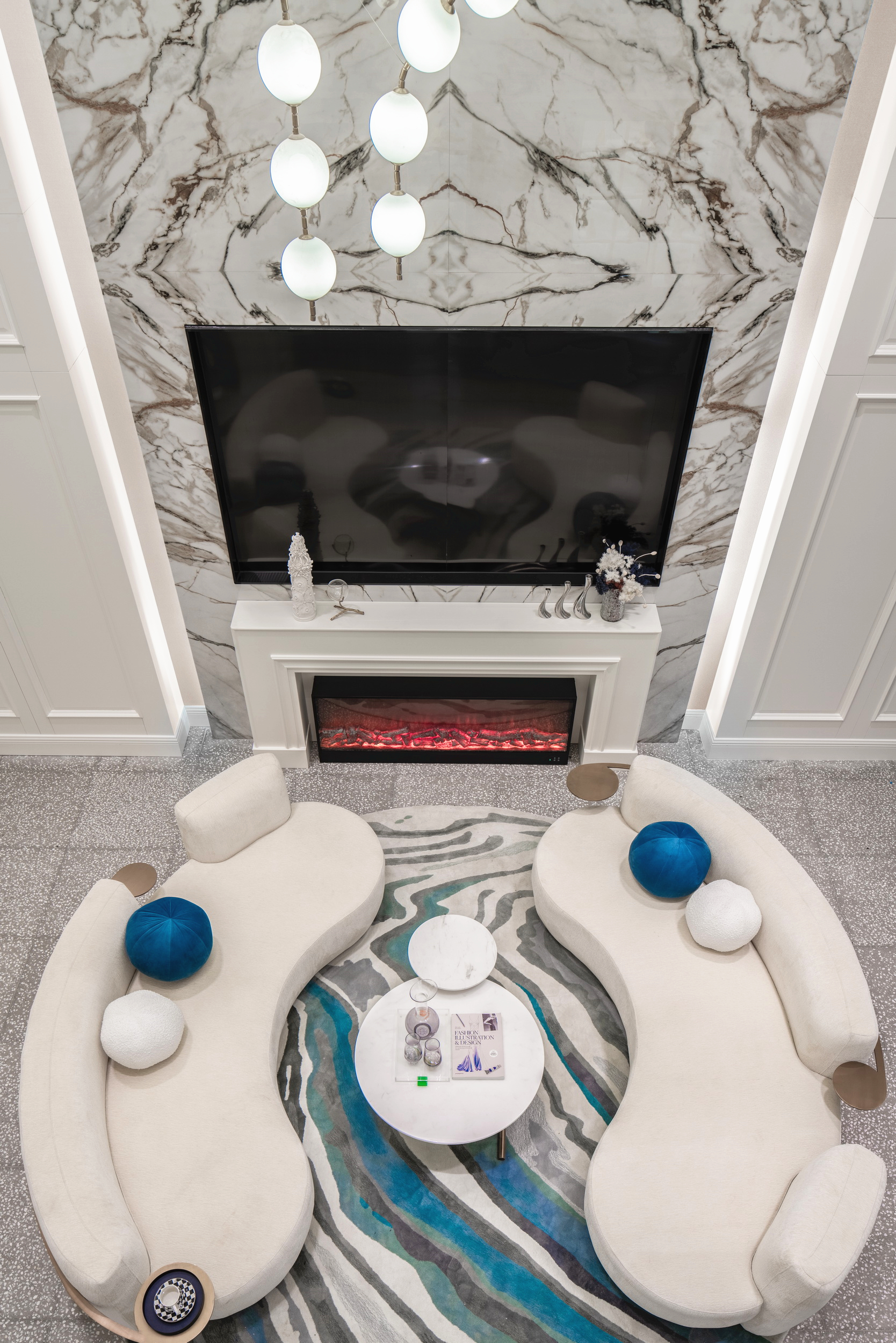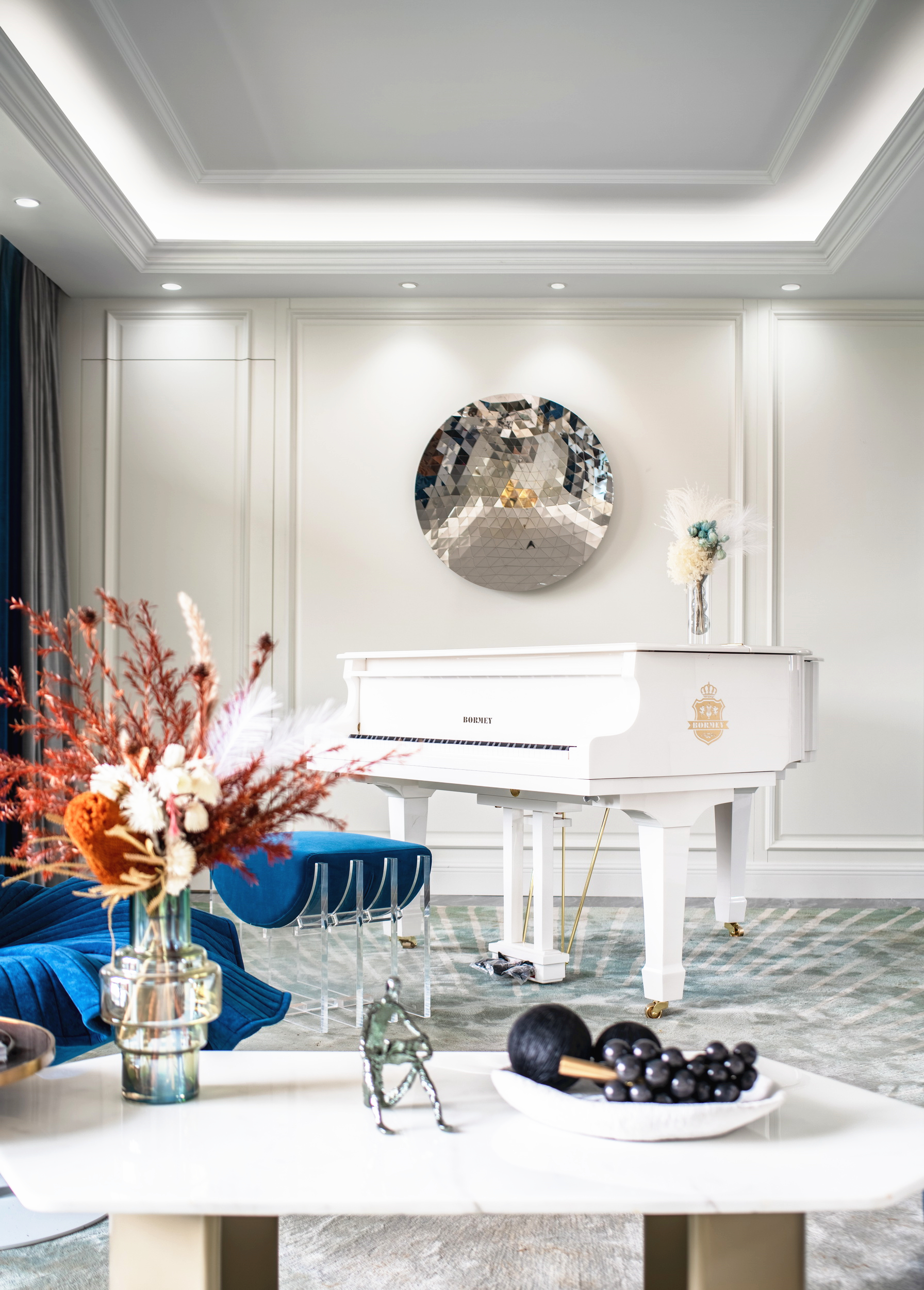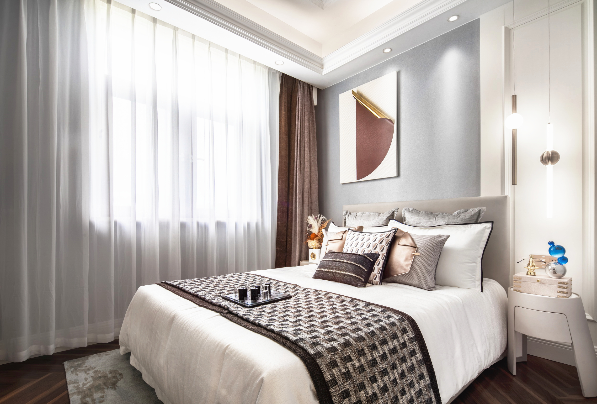 優(yōu)雅浪漫的藍(lán)調(diào),不繁復(fù),是空間的主角;些許暖橙是點(diǎn)綴,增添視覺層次;依托大量清新的淺色軟裝,空間內(nèi)色彩變化平緩過渡自然,與深灰色石材地面遙相呼應(yīng),讓置身其中的人,感受溫暖與明快。