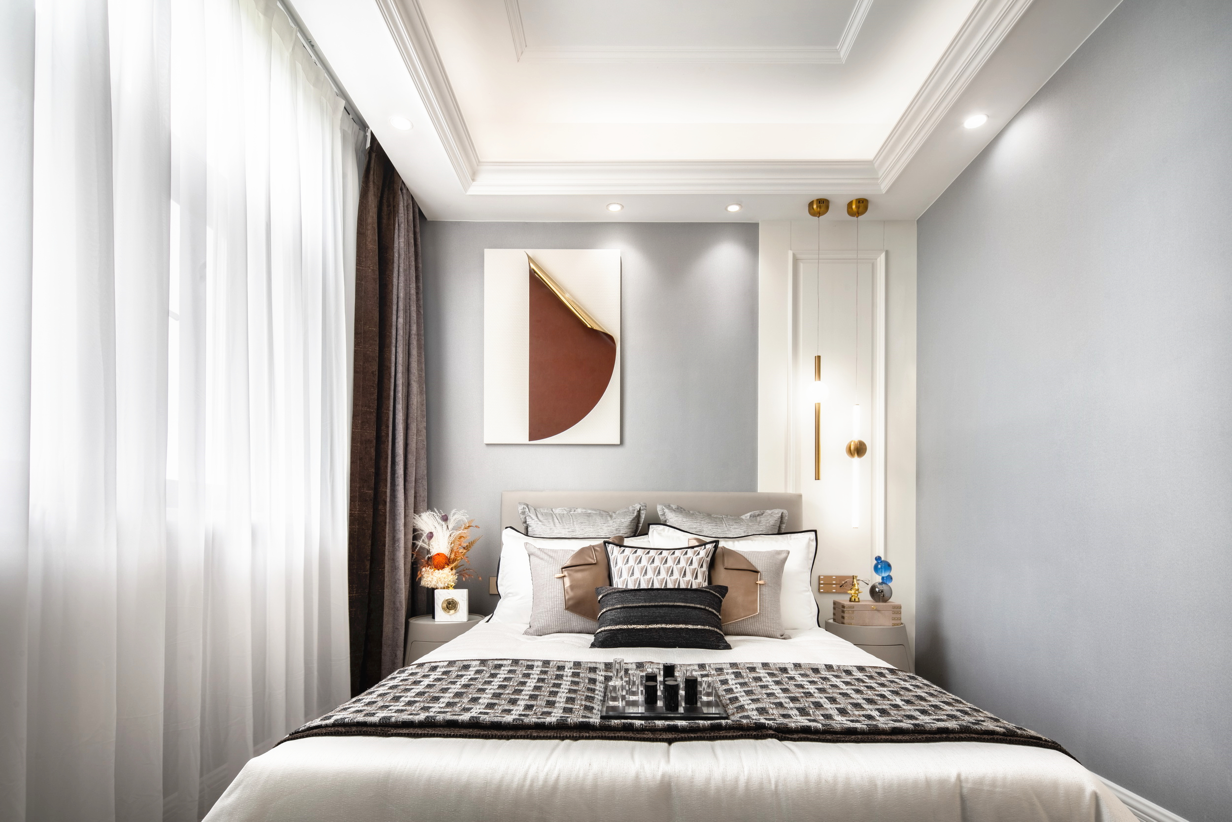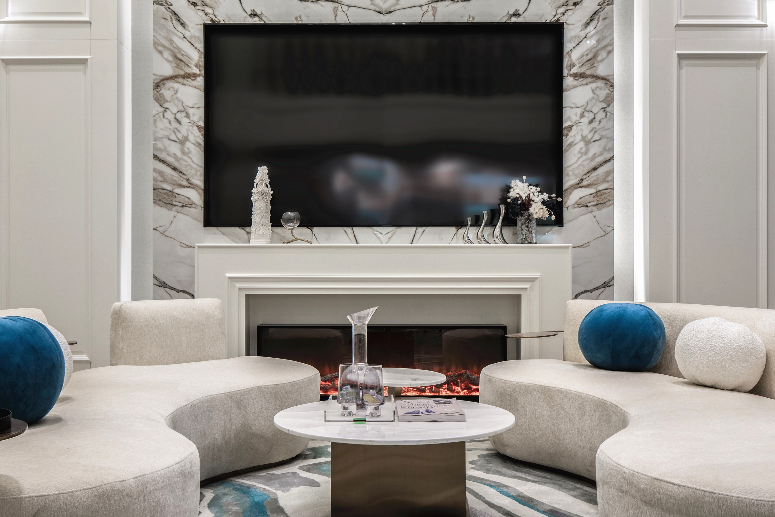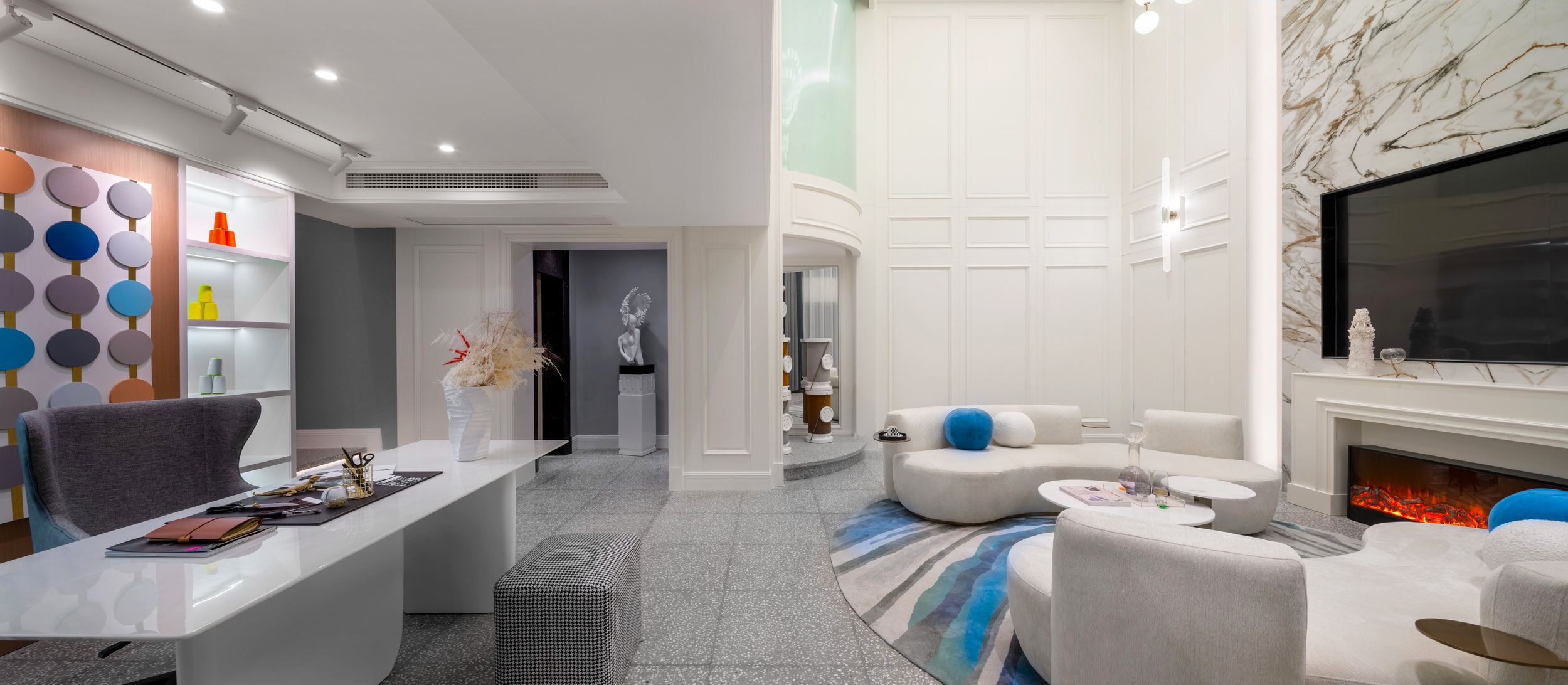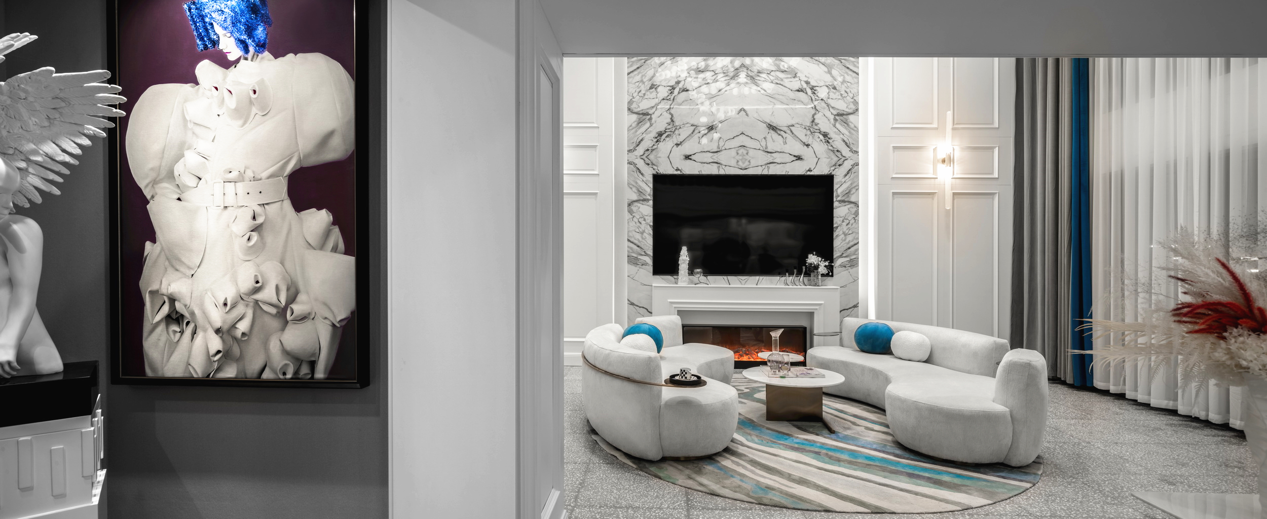 優(yōu)雅浪漫的藍(lán)調(diào),不繁復(fù),是空間的主角;些許暖橙是點(diǎn)綴,增添視覺層次;依托大量清新的淺色軟裝,空間內(nèi)色彩變化平緩過渡自然,與深灰色石材地面遙相呼應(yīng),讓置身其中的人,感受溫暖與明快。