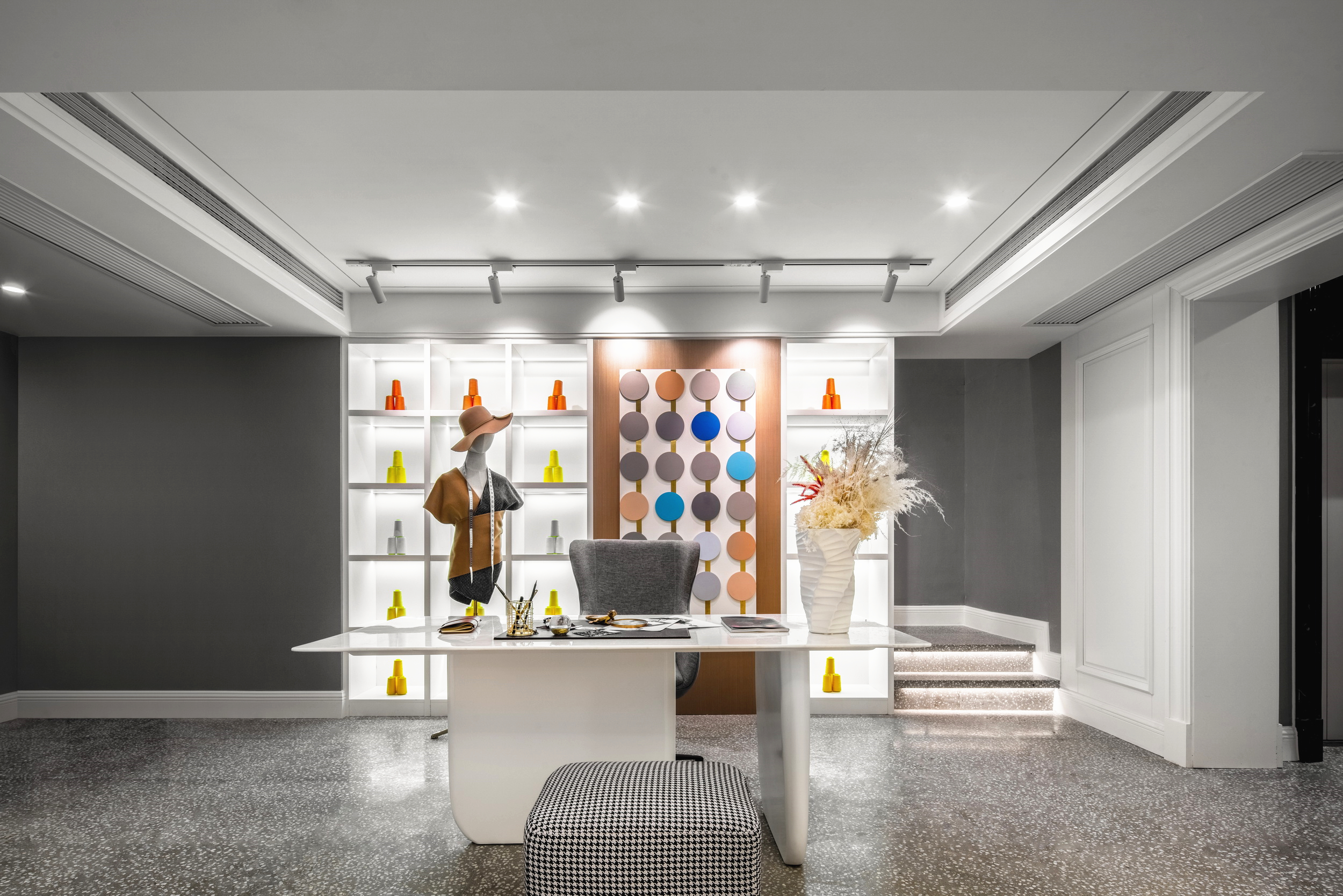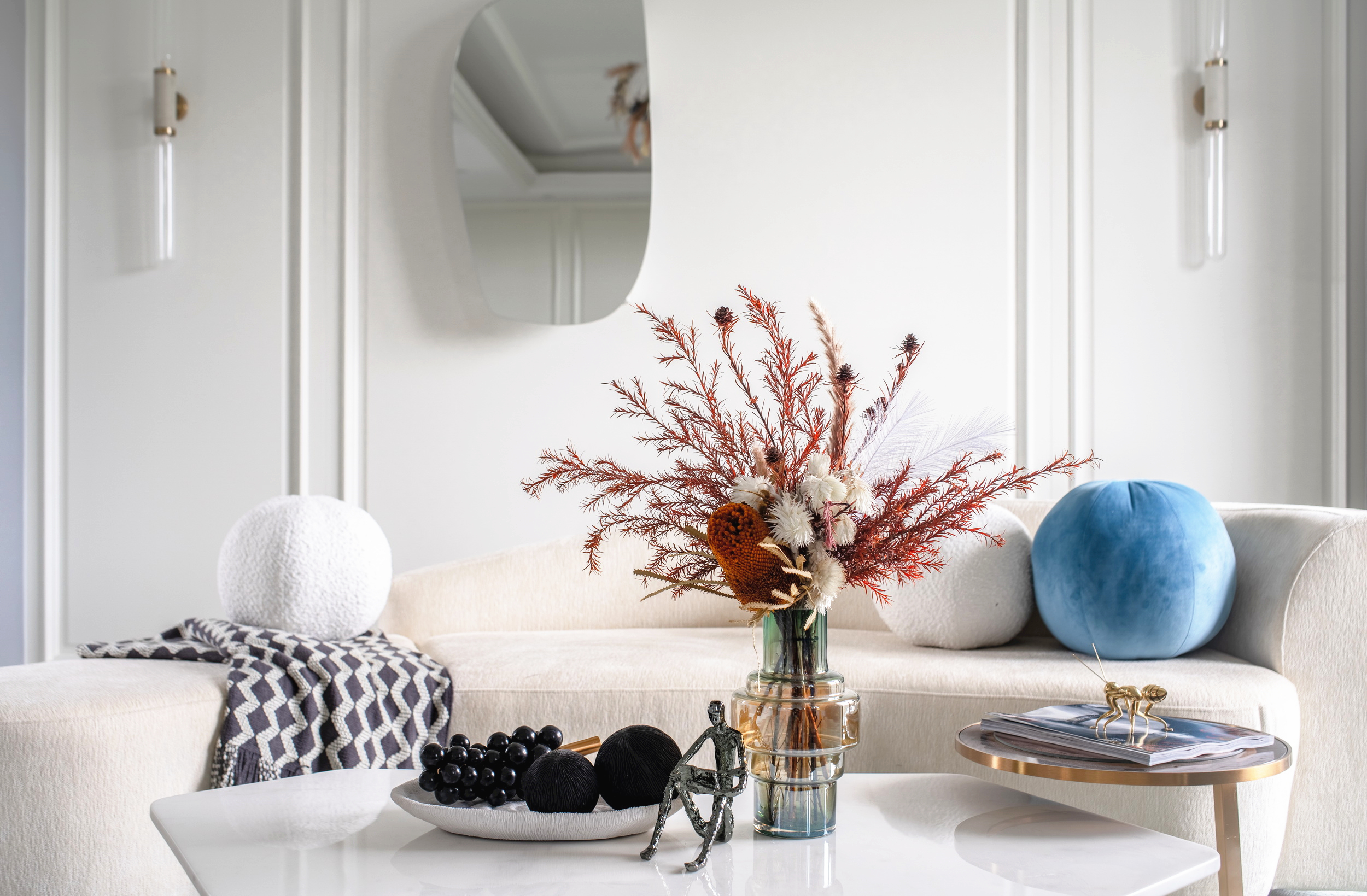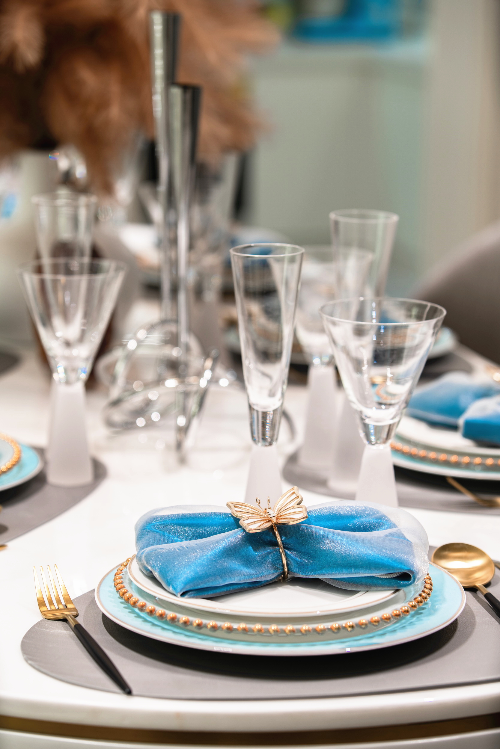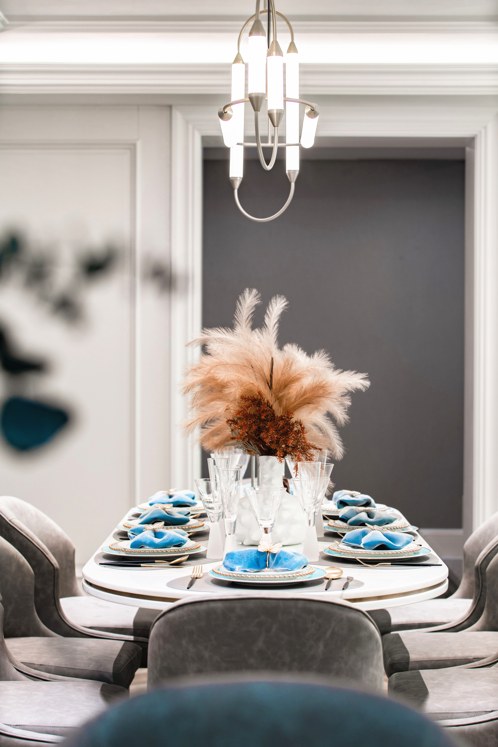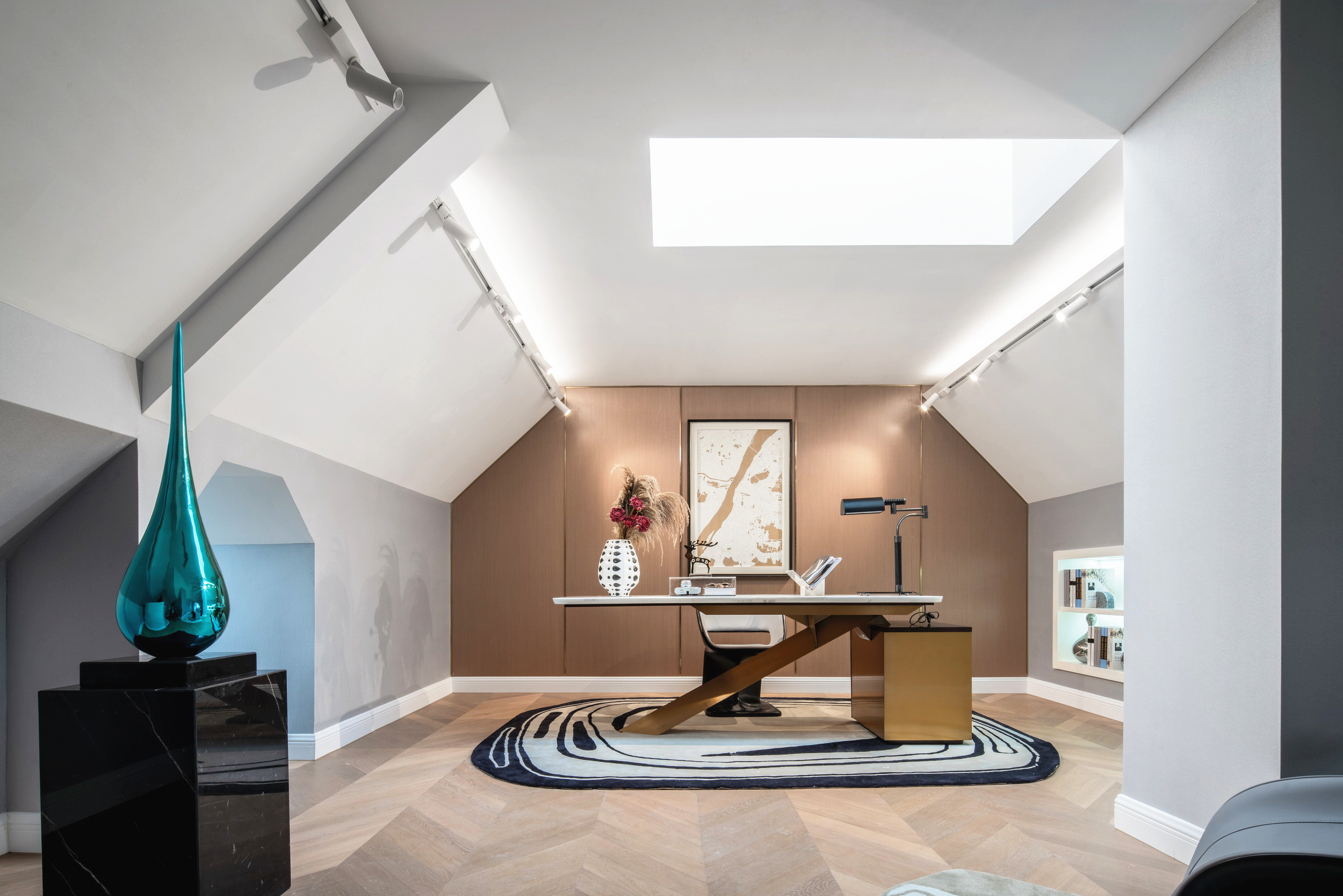 優(yōu)雅浪漫的藍(lán)調(diào),不繁復(fù),是空間的主角;些許暖橙是點(diǎn)綴,增添視覺層次;依托大量清新的淺色軟裝,空間內(nèi)色彩變化平緩過渡自然,與深灰色石材地面遙相呼應(yīng),讓置身其中的人,感受溫暖與明快。