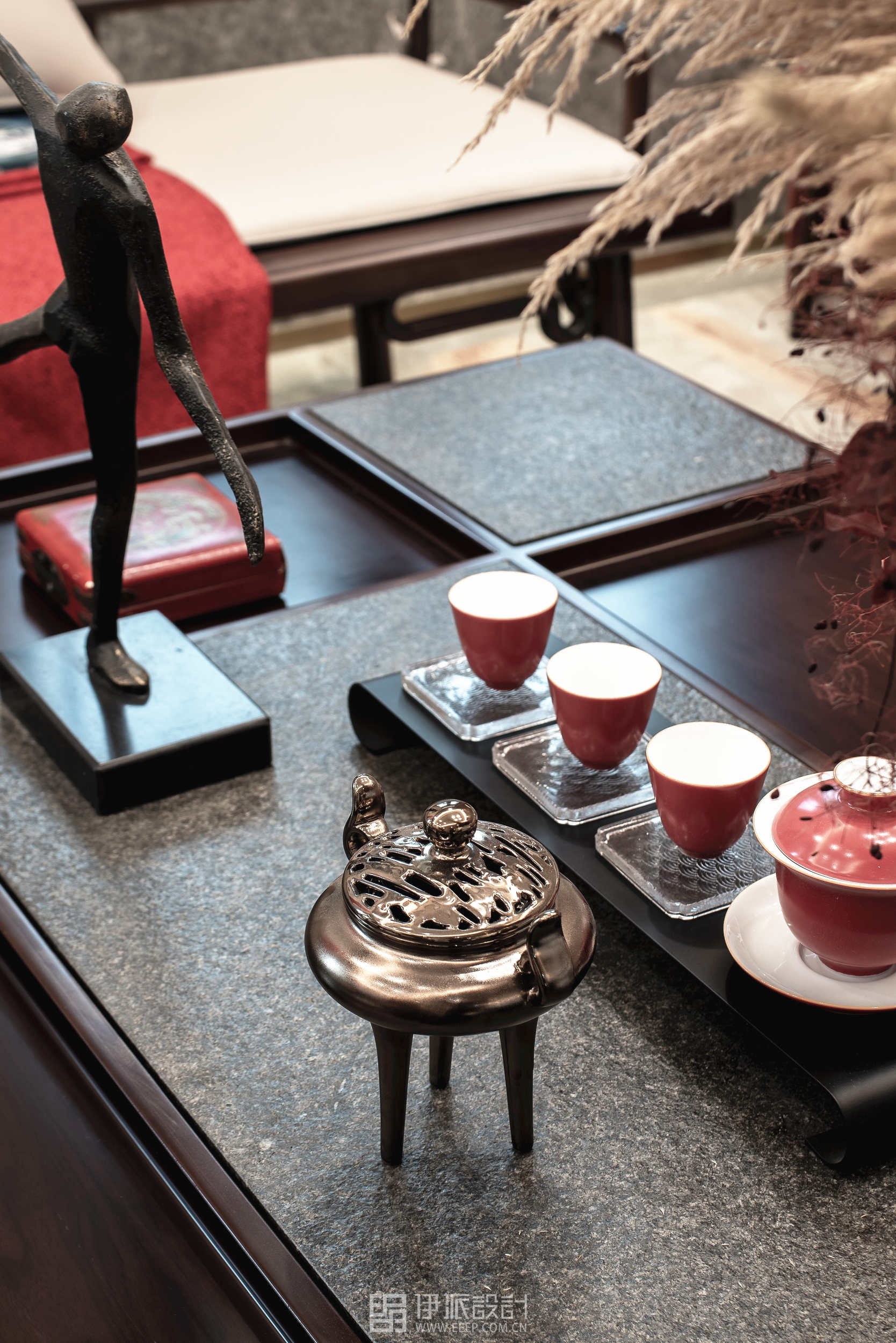 軟裝方面以純粹的木色作為基調(diào),大面積實木支撐起整個空間,瑪瑙紅色調(diào)的裝飾點綴其中,現(xiàn)代理性與東方雅致借由器物之間婉轉(zhuǎn)滲入整個空間。